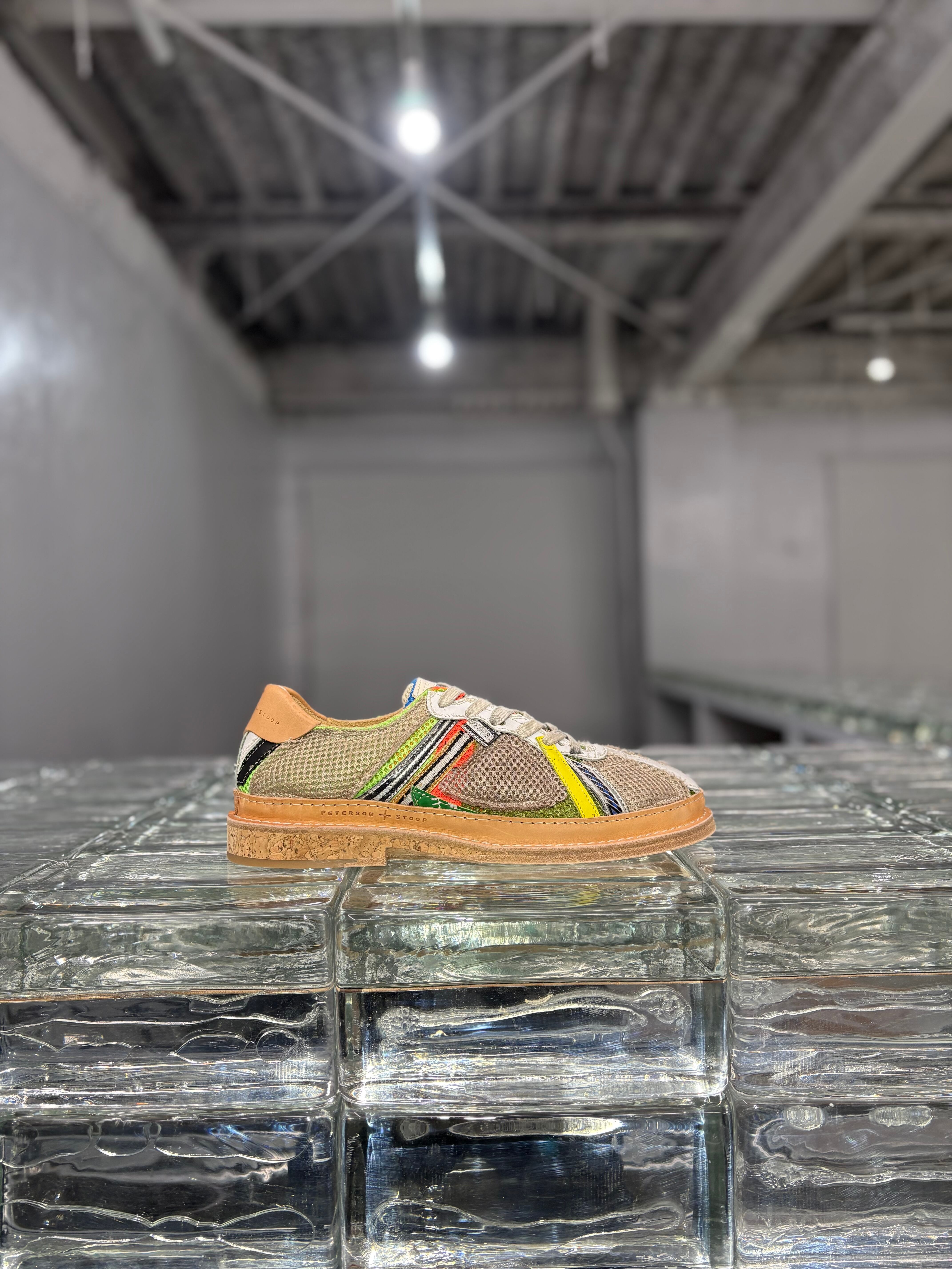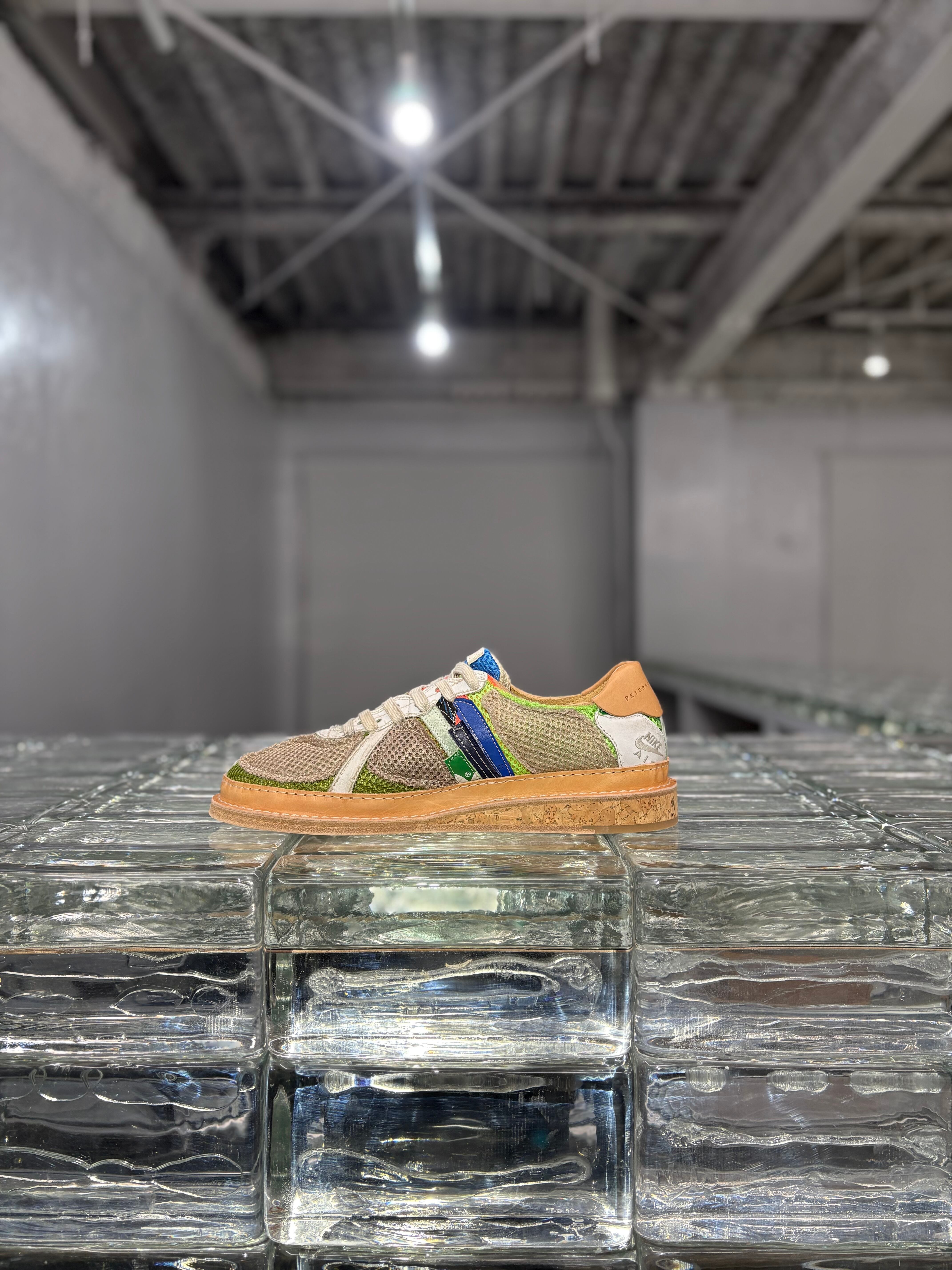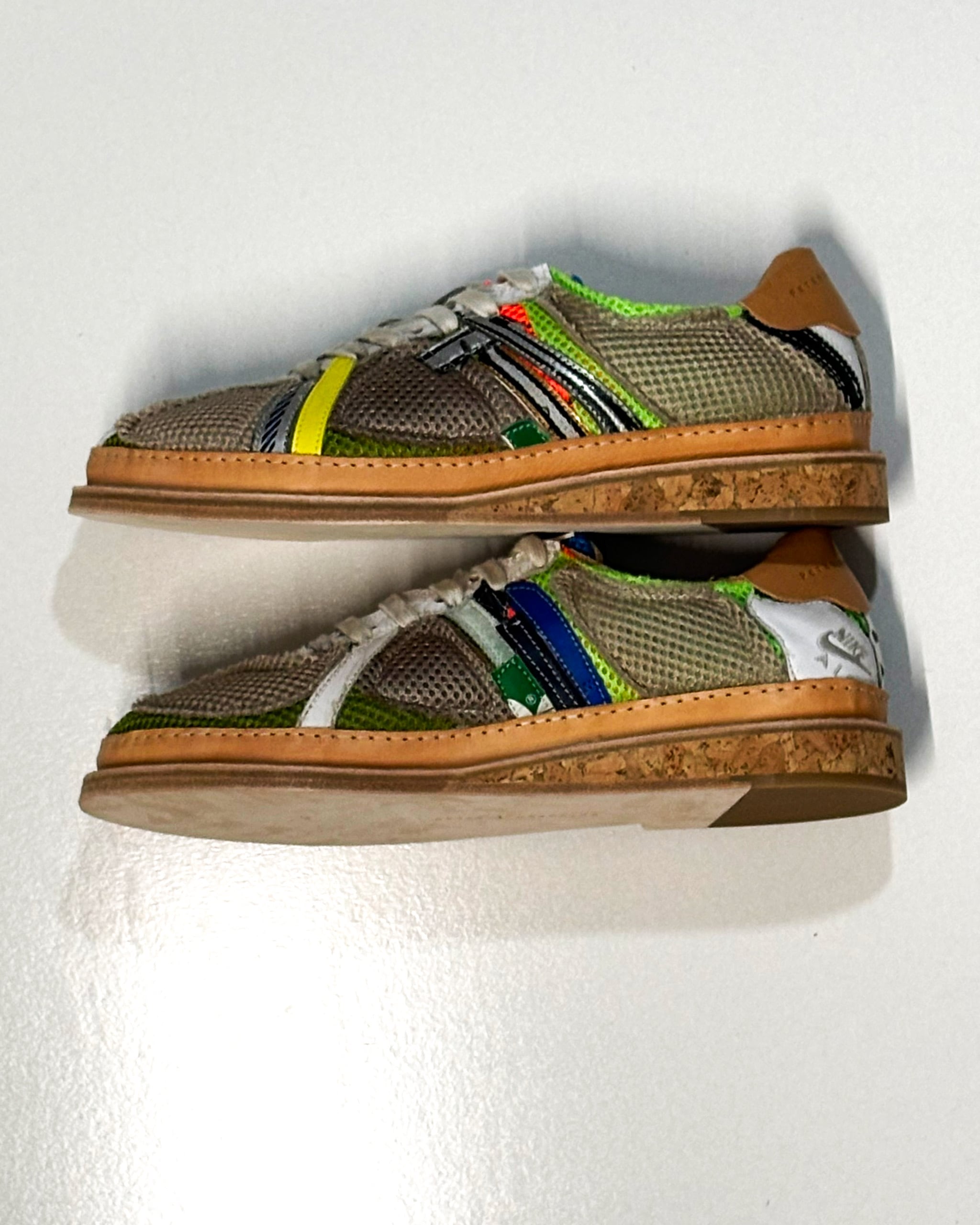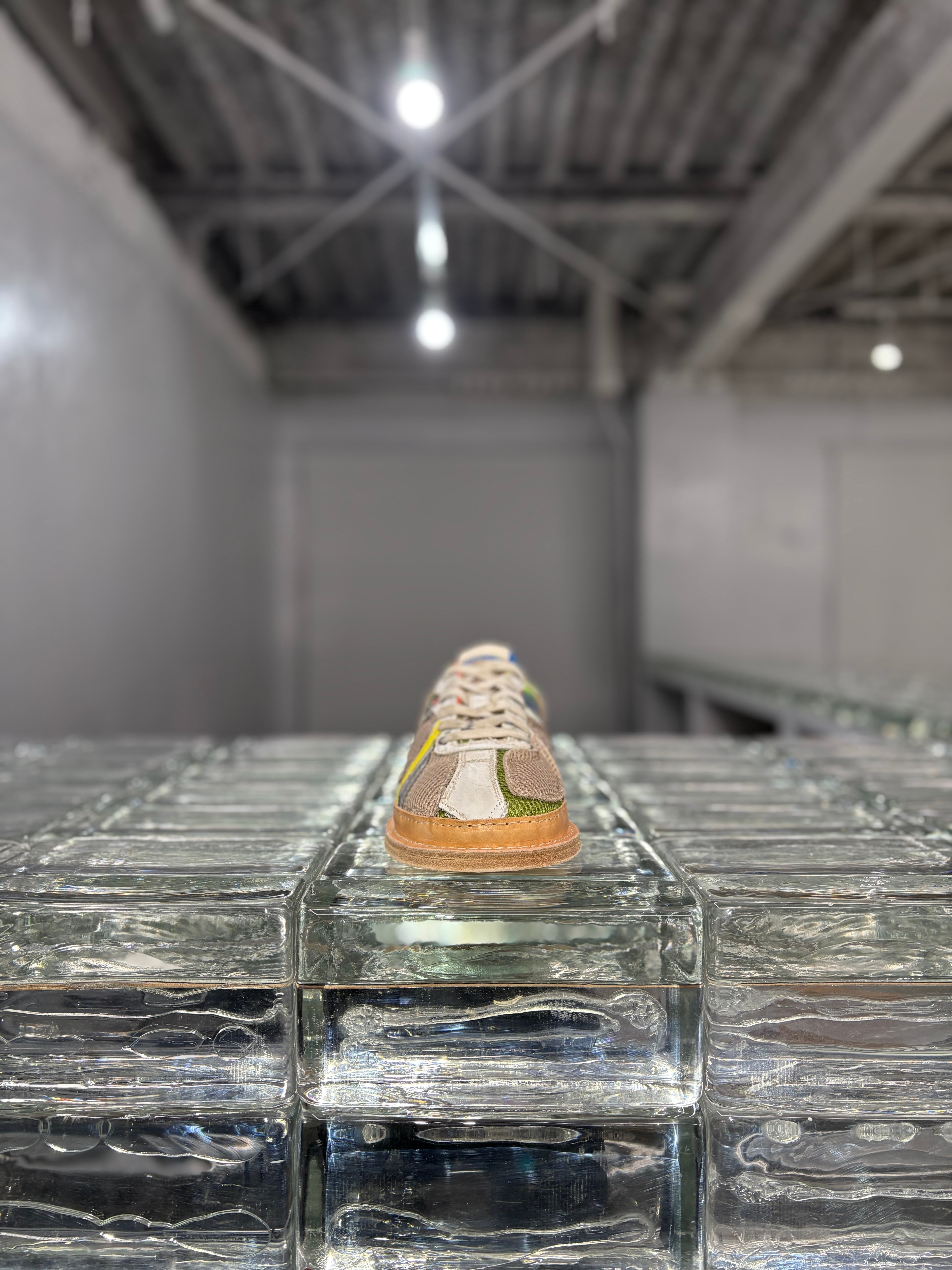 某有名シューズメーカー各社のUSEDスニーカーを分解し、一枚のシート状にパッチワーク。