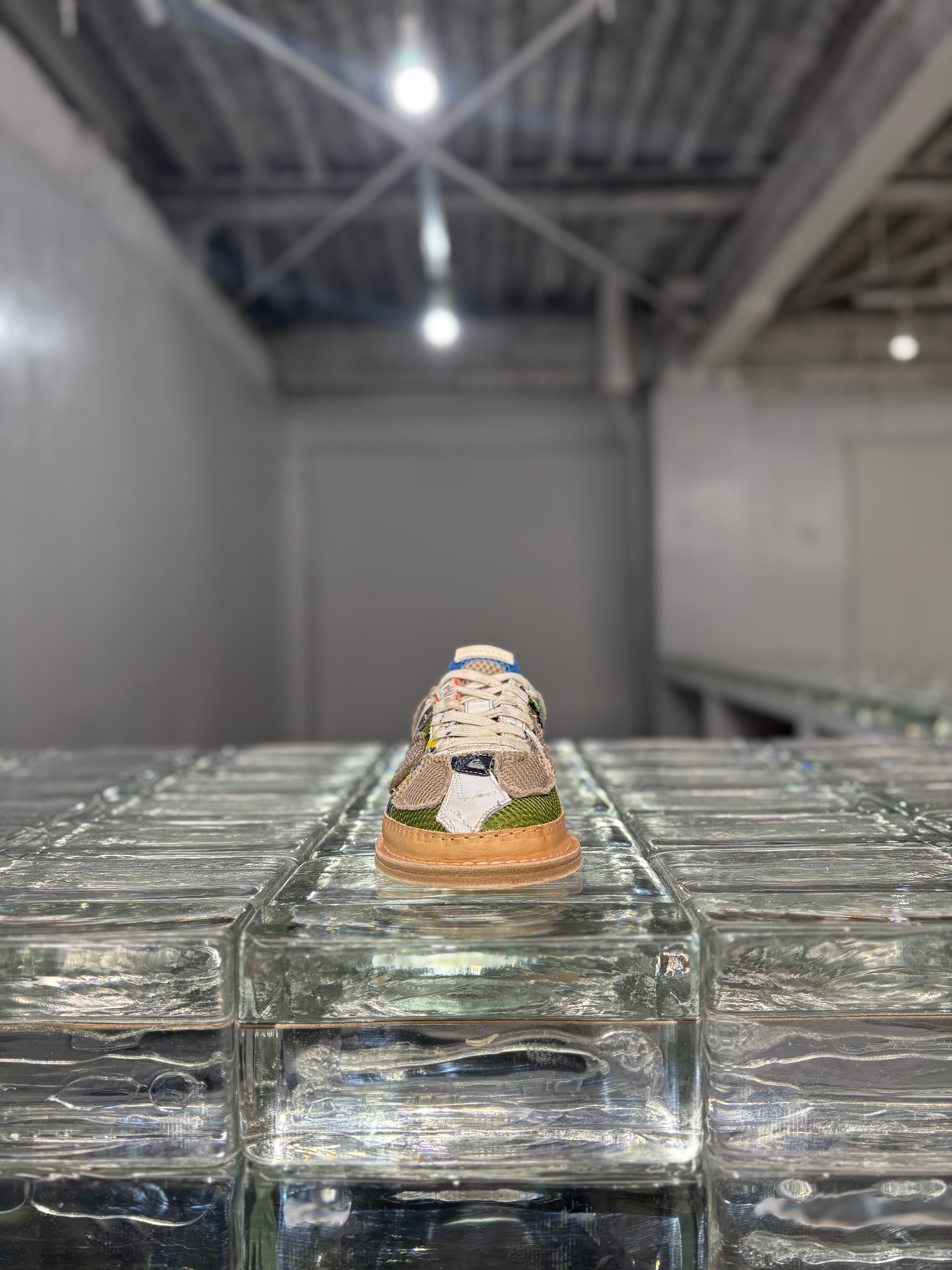 某有名シューズメーカー各社のUSEDスニーカーを分解し、一枚のシート状にパッチワーク。
