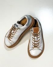 某有名シューズメーカー各社の加水分解したアッパーを再利用し、PETERSON STOOPが設計したコルクソールの木型、Bare footにハンドメイドで縫いあわせている一足。